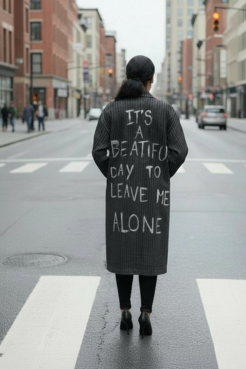 Sul retro, la scritta artistica “IT’S A BEAUTIFUL DAY TO LEAVE ME ALONE” rompe le regole con ironia e carattere, trasformando il cappotto in un manifesto di libertà personale. Ogni lettera è dipinta a mano con effetto raw, rendendo ogni pezzo unico e irripetibile.
