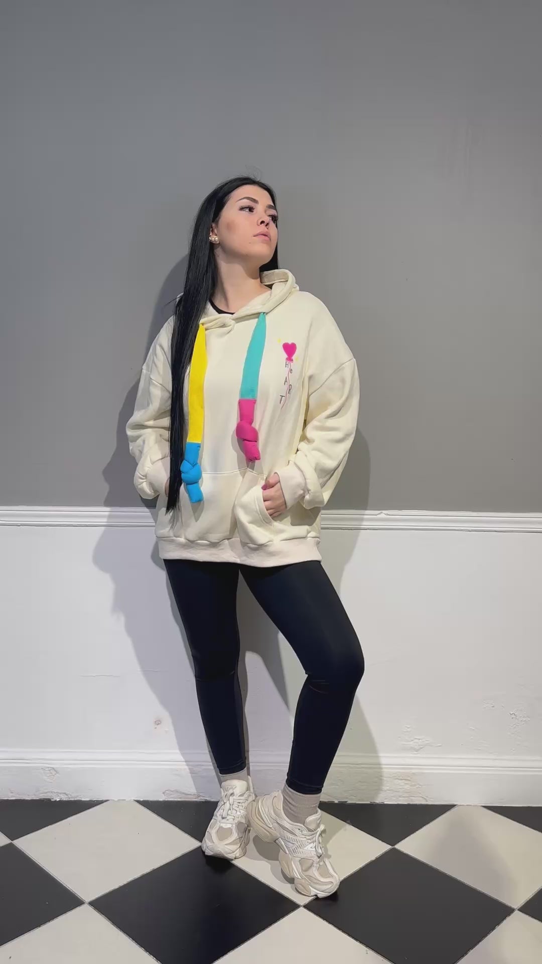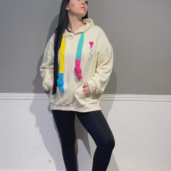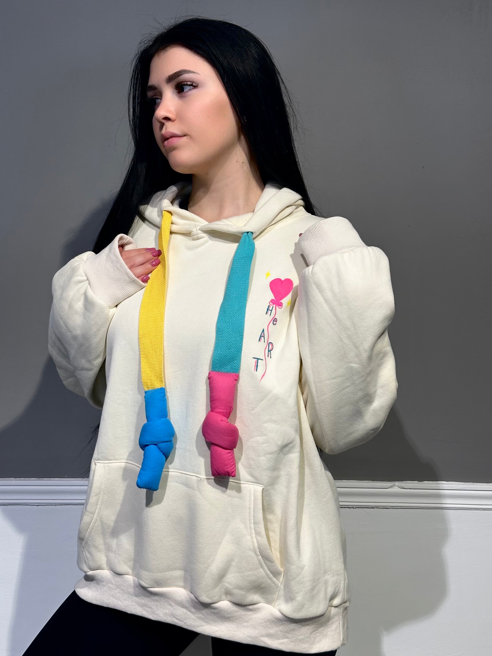 Felpa over customizzata color crema interno in pile, maxi lacci colorati, scritta ‘heart’ dipinta a mano.